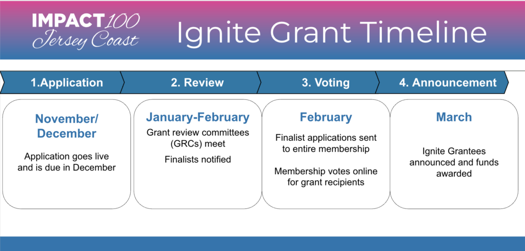 In 2025, Impact 100 Jersey Coast awarded four unrestricted Ignite grants of $4,500 each. When we announce our total funding pool for 2026, we will indicate the allocation to the Ignite grant program.